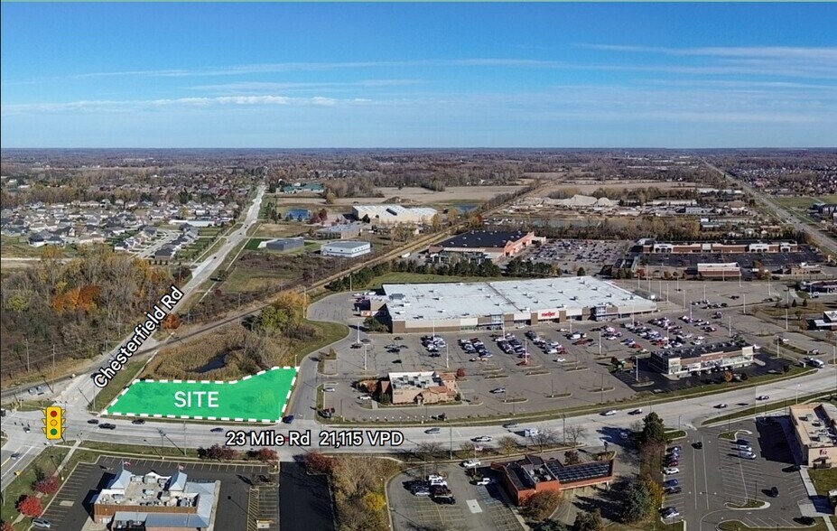 Position your business at the heart of Chesterfield’s thriving retail corridor with this exceptional pad site opportunity. Located at 27169 23 Mile Rd, this highly visible 1-acre corner parcel offers unmatched exposure and accessibility. Available for ground lease, build-to-suit, or lease, the site supports a wide range of commercial uses including retail, financial institutions, medical offices, restaurants with drive-thru, and automotive services. Utilities are already in place, and the proposed build is slated for 2026, ensuring modern design and infrastructure. This is the last remaining parcel within a dynamic retail hub anchored by national brands such as Meijer, Kohl’s, Lowe’s, and Walmart, guaranteeing strong consumer traffic and synergy. With over 21,000 vehicles passing daily and affluent demographics boasting household incomes exceeding $110,000 within a 5-mile radius, the location offers exceptional potential for sustained growth and profitability. Whether you’re expanding a regional footprint or launching a flagship concept, this site delivers the visibility, convenience, and market strength your business needs.
