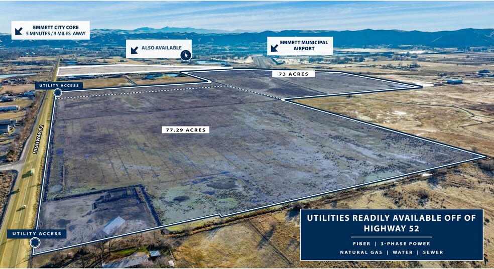$1,000,000 + DISCOUNT FOR THE BULK, 150.29 ACRE ASSEMBLAGE. Opportunity to purchase the front or back parcels separately or together, totaling 150.29 acres. Mixed-use land to accommodate industrial, residential, commercial, or a mix of uses. Already approved for 1 acre lot minimum throughout. Property boasts a half mile of highway frontage. Directly adjacent to the Emmett Municipal Airport. Rare opportunity to extend airstrip with hangar space and or rail to have on-site rail spur. Excellent potential to be accessed by rail, air, or highway. Prime gravel extraction area. Natural gas, electric power full access on all sides. Situated in Gem County, serviced by the city of Emmett. City of Emmett utility access with three deeded access points. Located in an area of significant growth (16.5% 5-year growth rate) with Hwy 16.