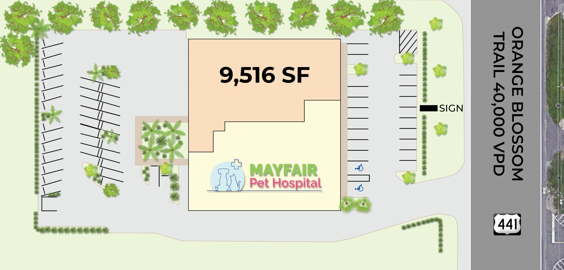 • 9,516 SF available for lease. • Adjacent to the highly regarded Mayfair Pet Hospital with excellent visibility along N. Orange Blossom Trail (US-441).