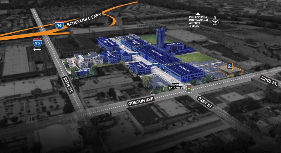 The Quartermaster @ 21st & Oregon offers a rare opportunity to lease space within one of Philadelphia’s most ambitious adaptive reuse developments. Formerly a military logistics center, this 24-acre campus has been transformed into a vibrant Science + Technology Park, blending historic architecture with modern infrastructure. The site features six Art Deco buildings anchored by a central clocktower, and is listed on the National Register of Historic Places. Tenants benefit from a wide range of space types including retail, creative experiential, bio/lab offices, and fitness uses. Ceiling heights range dramatically from 12 to 75 feet, with extensive skylighting and flexible layouts. The campus offers unmatched scale, including up to 330,000 SF under one roof and 180,000 SF on a single floor, making it ideal for large-format users. Strategically located in South Philadelphia, the property provides direct access to major highways, Center City, University City, and the Philadelphia International Airport. It’s also minutes from the city’s sports stadiums and bridges to New Jersey and Delaware. Ample parking and outdoor amenities—including a 2.5-acre lawn for events and pop-ups—enhance the tenant experience. The Quartermaster is actively seeking restaurants, breweries, retail operators, interactive experience creators, and fitness concepts to join its growing community.