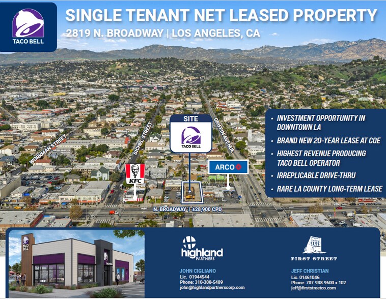 Highland Partners Corp is pleased to present the opportunity to acquire 2819 N. Broadway, Los Angeles, CA 90031. This freestanding building is currently 100% net leased to Taco Bell located in Los Angeles in Los Angeles County, California.