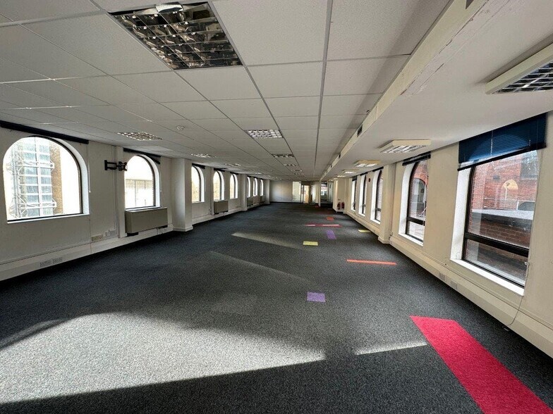 The offices are currently carpeted with suspended ceilings, recessed fluorescent lighting, metal perimeter trunking and electric heating, and benefit from good natural light through attractive arch shaped windows. There are a number of partitioned offices and a kitchen on each floor, with a server room on the second floor. There are shared toilets located on each floor, adjacent to the lift lobbies. The offices are to be let in an unrefurbished condition on competitive terms