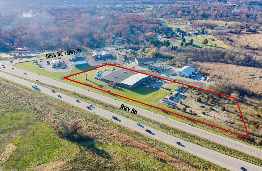 Great commercial building with over 28,000 sq ft on 3 acres. Hwy 36 frontage. Mixed use, retail, office and warehouse. Tall ceilings and overhead garage doors. Highly visible. Large monument sign can be seen for a mile. Depressed dock door. Ready for the growing business or investor.