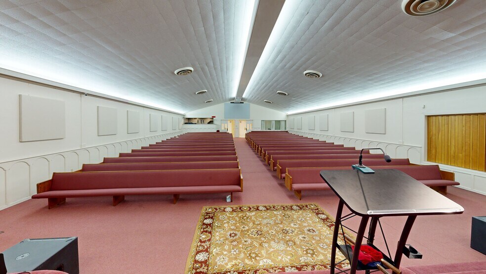 Philadelphia Pentecostal Church is an impressive brick structure ideally situated on Broadway Boulevard. The single-story building covers 11,414 square feet, offering substantial space for future possibilities. Philadelphia Pentecostal Church features traditional church architecture with a straightforward façade and columns. An inside sanctuary seats over 300, and the interior includes classrooms, offices, and a fellowship hall. The church is on 1.57 acres, which provides ample parking for 88 vehicles and additional outdoor areas. The property holds significant potential for continued religious use and redevelopment to fit new visions, such as a daycare or other business ventures.
