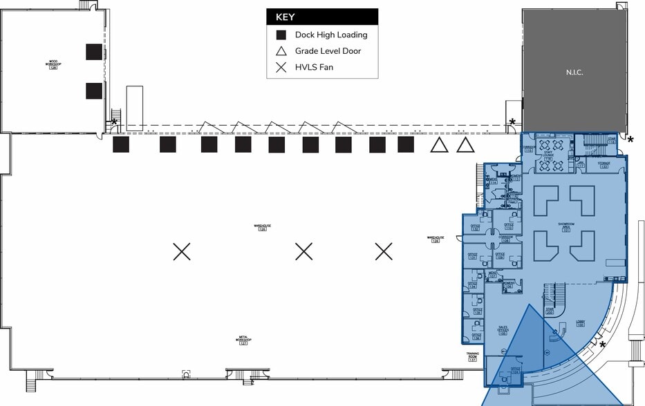 • Building: 56,709 SF • 1st Floor Office: 10,899 SF • 2nd Story Office: 9,386 SF • Clear Height: 24’ • Dock High Doors: 11 • Grade Level Doors: 2 • Column Spacing: 44’ x 42’ • Truck Court Depth: 110’ • Car Parks: 60 • Fully Secured Parking and Truck Court • Sprinklered • 3 HVLS fans