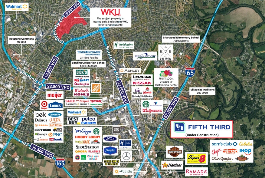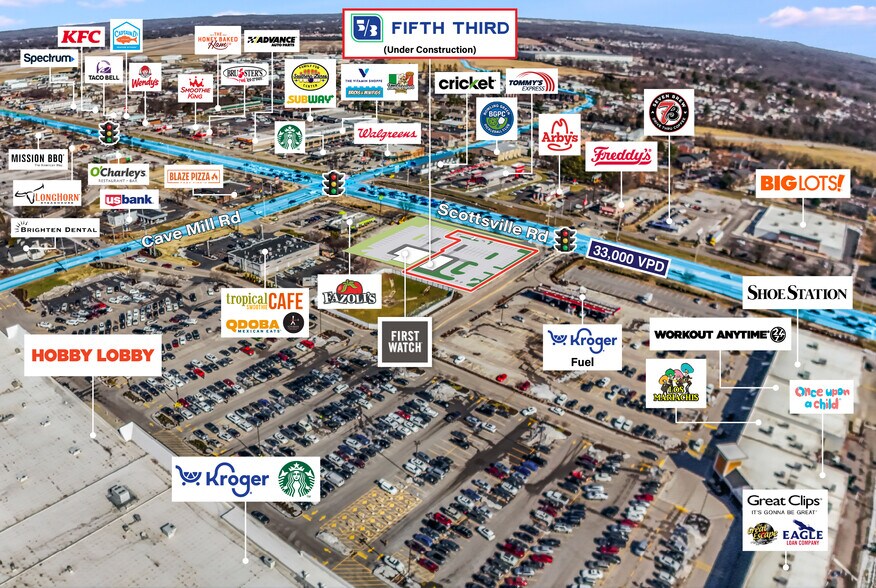 Strategically positioned along Scottsville Road, the dominant retail and commercial corridor in Bowling Green, the property commands high-volume exposure with 33,000 vehicles per day passing directly in front on Scottsville Road, complemented by an additional 15,000 vehicles per day on the adjacent Cave Mill Road. Fifth Third Bank occupies a newly constructed 2,400-square-foot building on-site, offering strong frontage and convenient access. Surrounded by dense commercial development and sustained residential growth, the property is perfectly positioned to benefit from increasing daily consumer traffic.