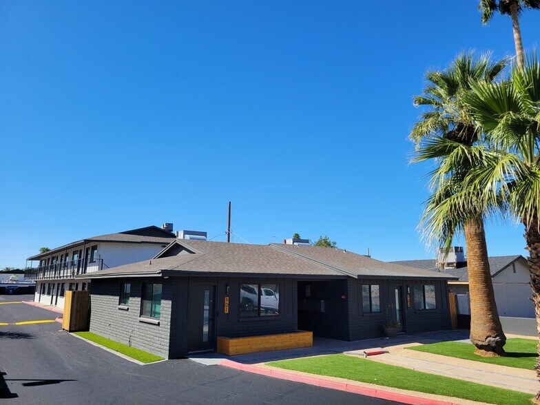 Significant exterior capital improvements were made that transformed the courtyard and community. These improvements include modern exterior paint and a redesigned and refinished private resident courtyard with modern concrete poured paths and a large concrete decking area for residents to enjoy. In addition all new modern desert landscaping was added within the shaded courtyard. New landscaping includes attractive desert rock, a flowering bougainvillea garden, large shade trees and a large iconic Arizona saguaro cactus. A large modern wrought iron fence was installed to enclose the courtyard and several gates with modern handles were installed providing entry for residents. One of the downstairs units has a modern glass back door with in-set blinds and a large private patio. Several other downstairs units have additional back patio space with the ability to add more private patios and increase rental rates on those units.