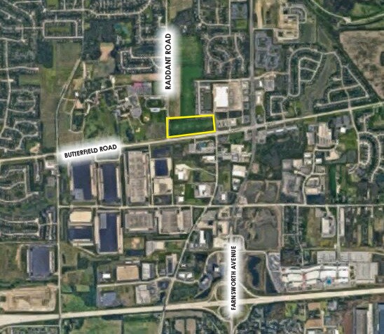 Set at the prominent corner of Butterfield Road and Raddant Road in Aurora, this 13.22 +/- acre tract presents a compelling commercial development opportunity with exceptional visibility and access. The site fronts a busy, signalized intersection and is easily divisible, enabling phased development, multi-tenant strategies, or single-user concepts. Regional connectivity is excellent with immediate proximity to I-88 and Route 56, placing the property minutes from key employment centers, the Chicago Premium Outlets, and established retail corridors along Butterfield and Kirk Roads. Surrounding rooftops and nearby commercial nodes support daily-needs retail, medical, restaurant, and service uses, while the planned casino project in the area signals continued investment and future visitor traffic. The parcel’s clean rectangular configuration and multiple frontage points support efficient circulation, signage presence, and thoughtful site planning.