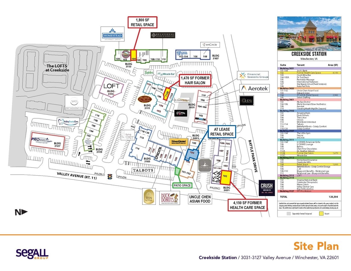 Creekside Station est un complexe de boutiques, de restaurants et de services magnifiquement conçu situé sur Valley Avenue, dans le sud de Winchester, en Virginie. Le projet comprend des vêtements nationaux (Talbots, LOFT, Jos A Bank & Chicos), des services, des services, des services, des services médicaux, financiers, juridiques et divers usages de restauration dans un environnement bien aménagé et praticable à pied. Deux projets de bureaux adjacents, Creekside Village et Opequon Center, fournissent une population diurne supplémentaire et attirent des clients. Les nouveaux propriétaires recherchent des utilisations complémentaires pour améliorer la gamme de produits haut de gamme existante.