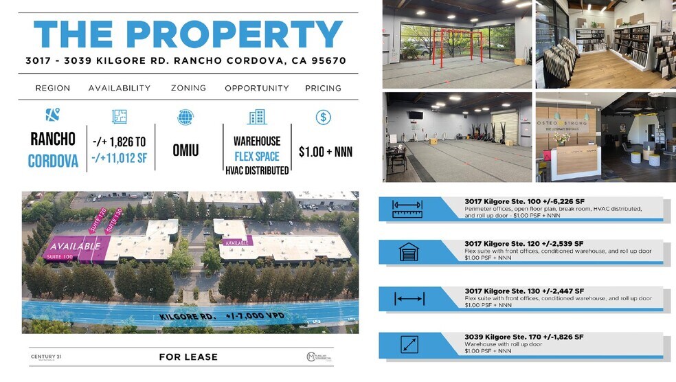 Les 3017 — 3039 Kilgore Rd. à Rancho Cordova, en Californie, sont deux bâtiments flexibles situés à l'est de Zinfandel Dr. et à l'ouest de Sunrise Blvd. avec White Rock Rd. immédiatement au sud et l'autoroute 50 plein nord. Chaque bâtiment a une superficie de +/- 27 239 pieds carrés, soit un total de +/- 54 478 pieds carrés. Le 3017 Kilgore Rd. dispose de +/- 11 012 pieds carrés de FLEX SPACE et le 3039 Kilgore Rd. +/- 9 358 pieds carrés disponibles. Les principales caractéristiques de ces bâtiments flexibles incluent de multiples portes enroulables ouvertes et une disposition flexible pour une multitude d'utilisateurs. Les locataires auront l'avantage d'utiliser la disposition flexible à leur avantage pour répondre au mieux aux besoins de leur entreprise. De plus, les locataires peuvent bénéficier du grand terrain de stationnement et des multiples points d'entrée et de sortie pour les gros véhicules, non loin du boulevard Sunrise et de l'autoroute 50. Les bâtiments offrent une grande entrée centralisée entourée d'un paysage bien entretenu avec un parking propre offrant un grand parking à l'avant et à l'arrière des bâtiments. Un taux de location compétitif, un propriétaire motivé, un aménagement flexible et un paysage et des bâtiments bien entretenus en font un lieu de location idéal.