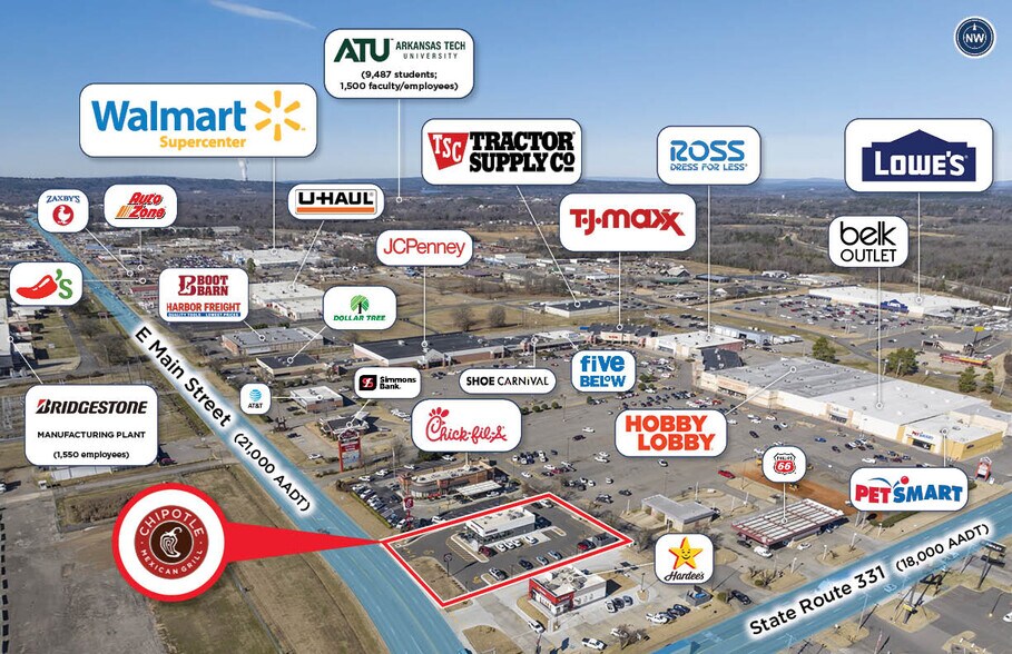 Situated at 3095 E Main St, Russellville, AR, the property benefits from 21,000 AADT on E Main St and 18,000 AADT on Hwy 331. Its placement at a signalized corner ensures high visibility and easy access for customers. The site is an outparcel to a Hobby Lobby-anchored center, amplifying its exposure to retail traffic. Directly across from Conagra Brands’ manufacturing facility, a key employer, the site benefits from steady worker traffic. Nearby retailers like Hobby Lobby, Walmart, and AutoZone enhance the commercial corridor’s appeal. The location’s adjacency to I-40 (40,000 AADT) ensures regional connectivity.