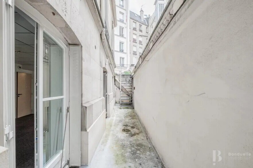 Immeuble résidentiel avec local commercial en pied d'immeuble, doté d'une belle façade de style haussmannien avec un balcon filant au deuxième étages et de beaux encadrements de fenêtres. En fond de cour, partageant l'entrée de l'immeuble résidentiel en façade, on y trouve un immeuble de bureaux de deux étages, avec de grandes fenêtres en façade, profitant d'un environnement calme et protégé des bruits de la rue.