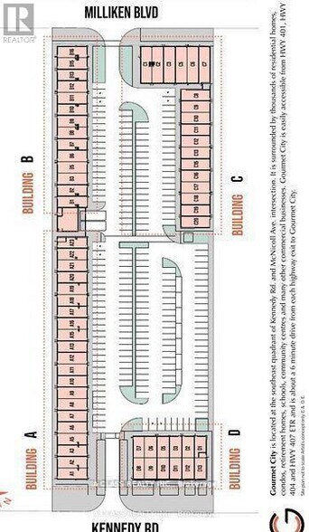 Gourmet City Commercial Condos is situated in Scarborough, at a strategic and convenient location at the SE quadrant of Kennedy Rd and McNicoll Ave, offering great exposure on Kennedy Rd, with direct access from Kennedy Rd and Milliken Blvd. The development by H & H Group features a modern design with high quality finishes. Brand-new unit with mezzanine in raw condition. Brand-new unit with Various permitted uses including retail, bakery, cafeteria, bubble tea, salon & more. Great business ventures cater to different cultures. Versatile space with minutes drive to Hwy 404/407. High Ceiling. Tenant responsible for TMI & utility charges. (Tax estimate $1485/mon, Management fee $395/mon, Insurance estimate $100/mon). This unit is close to Kennedy Street with good exposure.