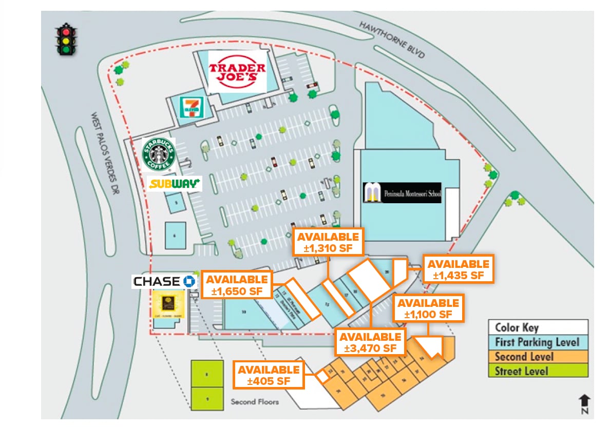 Plusieurs unités commerciales et de bureaux sont disponibles dans l'important centre du quartier ancré de Trader Joe's à Prime Rancho Palos Verdes. La propriété offre une grande visibilité sur la rue, une signalisation bien visible sur les monuments, un vaste parking sur un vaste terrain (320 places de stationnement) et une vue sur l'océan partout ! Le centre accueille un large éventail de colocataires nationaux et régionaux A+, notamment Trader Joe's, Starbucks, Subway, Yellow Vase, 7-Eleven, l'école Peninsula Montessori et bien d'autres encore ! Les unités sont disponibles pour une occupation immédiate. Le site est situé à l'intersection principale signalée du boulevard Hawthorne et de la promenade Palos Verdes West.