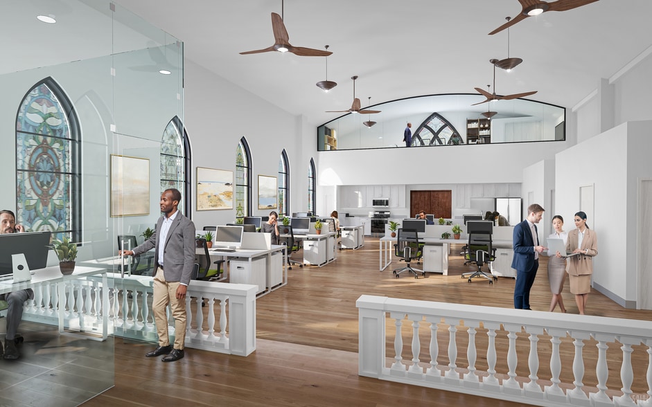 The Hall presents a rare and exceptional opportunity for local businesses to establish a dynamic live/workspace that embodies their unique vision and brand. Designed for versatility, it can seamlessly adapt to a variety of uses, whether as a boutique retail shop, co-working hub, art gallery, or wellness studio. The only limit is imagination, making it the perfect destination for entrepreneurs and creatives seeking a distinctive environment. This one-of-a-kind space features two private offices and a third area in the choir loft, ideal for meetings or brainstorming sessions. A private entryway and foyer enhance exclusivity, while two exterior entrances and one interior entrance provide convenience and accessibility. The full kitchen is equipped with energy-efficient appliances, and the unit includes two full bathrooms along with an in-unit washer and dryer for added comfort. The multi-level layout, complete with a stunning vaulted ceiling, adds character and charm. Zoned C-1 for residential and commercial use, this space also benefits from Arts & Entertainment District incentives, offering valuable opportunities for business growth. Ample street parking ensures smooth commuting and easy client access.