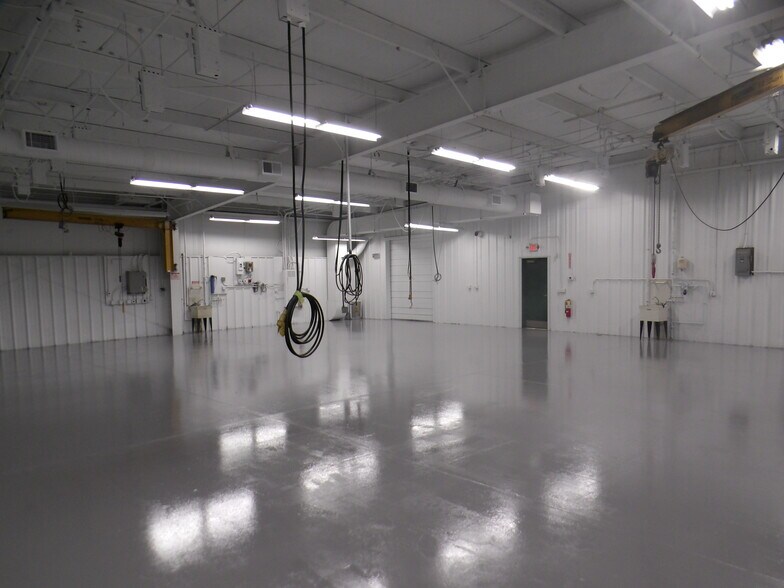 Efficient Building Features: 12’–13’ Clear height, one (1) drive-in door, three (3) ½-ton jib cranes in place, and 100% air conditioning throughout.