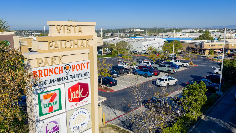 The HUB at Vista Palomar Park ± 27,650 SF Neighborhood Retail Center Property Overview Vista Palomar Park is a neighborhood retail center located along the busy Palomar Airport Road corridor in Vista, serving nearby residential communities and business parks. The property offers strong visibility and convenient access, attracting steady local and commuter traffic. Its mix of retail, dining, and service tenants makes it a convenient everyday shopping destination for the surrounding area. Property Highlights - Centrally located between Carlsbad, San Marcos, and Vista. - Strategically next to a dense business park corridor with immediate access to 100,000+ daytime employees. - Positioned adjacent several affluent neighborhoods - Strong weekday breakfast, lunch and services demand from business park corridor makes for dual customer base. - Affluent residential neighborhoods driving evening and weekend traffic. - Curated tenant mix: food, wellness, and service-oriented tenants. - Local, regional and national brands such as Starbucks, 7-11, Jack in the Box, Ichiban Japanese, My Gym, Star Nail Salon, Poke Jaws. - Designed to support daily visits and cross-shopping. - Prominent street frontage with 32,200 avg daily traffic. - Easy access at signalized corner. - Abundant parking directly in front of tenants. - Adjacent high traffic locations include Target, San Marcos High School, Carlsbad Airport, Lowes, and more.