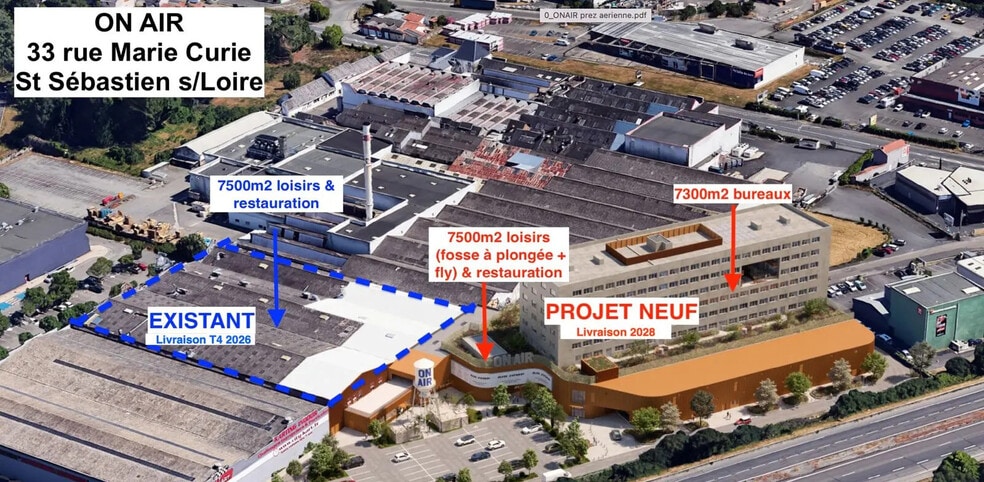 Immeuble commercial de 15000 m2 situé à Saint-Sébastien-sur-Loire comprenant 7000 m2 de bureaux et 8000 m2 dédiés aux loisirs et à la restauration. Surfaces brutes commerciales disponibles dès octobre 2026 pour le bâtiment existant rénové et à partir de juin 2028 pour le bâtiment neuf. Le rez-de-chaussée et le premier étage du bâtiment existant sont dédiés aux activités de loisirs et de restauration dont fosse de plongée, simulateur de chute libre, restauration et salle de sport. Le bâtiment neuf proposera également des espaces de loisirs et de restauration en rez-de-chaussée et premier étage, ainsi que 7000 m2 de bureaux du deuxième au septième étage. Le site dispose de 240 places de stationnement réparties sur deux niveaux en sous-sol. Emplacement stratégique à proximité du périphérique N844 et du complexe commercial, avec accès direct au pôle sportif et de loisirs. Quartier déjà doté de nombreux restaurants et activités de loisirs. Proche de la halte ferroviaire Frêne Rond et bien desservi par les transports en commun. Emplacement en bordure du périphérique routier Accès direct au complexe commercial Accès direct au pôle sportif Accès direct au pôle de loisirs Proximité de la halte ferroviaire Frêne Rond Proximité de restaurants variés Proximité d'activités de loisirs Quartier desservi en transports en commun Cellules livrées brutes de béton Fluides en attente dans les cellules Extraction prévue pour les cellules de restauration Stationnement client devant le bâtiment Stationnement client derrière le bâtiment Stationnement partagé en sous-sol Stationnement sécurisé en sous-sol Bornes électrique de recharge Activités autorisées loisirs Activités autorisées restauration Situation/Transports : SNCF St-Sébastien-Frêne-Rond Bus Curie BUS-27 Bus Vertonne BUS-28 Bus Vertonne BUS-102 Bus Cassegrain BUS-42 Bus Frêne Rond BUS-172 Dépot de garantie : 3 mois de loyer HT/HC Conditions particulières à la location : 1 place de parking en sous-sol pour 55m2 20 emplacements équipés de borne de recharge (IRVE) LOYER PARKING NU : 900 euros HT/u/an LOYER PARKING IRVE : 1200 euros HT/u/an