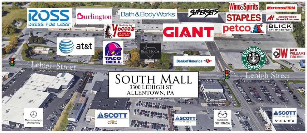 Le bail du locataire principal Giant Foods est maintenant signé ! Le South Mall est la destination de shopping la plus grande et la plus active du South Side d'Allentown. Le centre commercial propose un mélange fantastique de locataires commerciaux nationaux, régionaux et locaux. Les principaux locataires principaux sont les suivants : -Giant - Bientôt disponible ! -Robe Ross pour moins cher -Burlington -Agrafes -Magasin d'alcool de l'État -Salle de sport SuperSets Parmi les autres locataires nationaux, régionaux et locaux en vedette, citons A1 Steakhouse, Petco, Bath and Body Works, Blick Art Materials, Starbucks, Mattress Firm, Yocco's-the Hot Dog King et de nombreux autres magasins de détail et restaurants exceptionnels. Nous avons actuellement des magasins disponibles à la location immédiate au centre commercial. Il existe également des possibilités de kiosque et des opportunités d'espace temporaire. Veuillez appeler pour plus de détails. Le South Mall est idéalement situé sur Lehigh Street, à quelques minutes de la route 22, de la route 309 et de la sortie I-78.