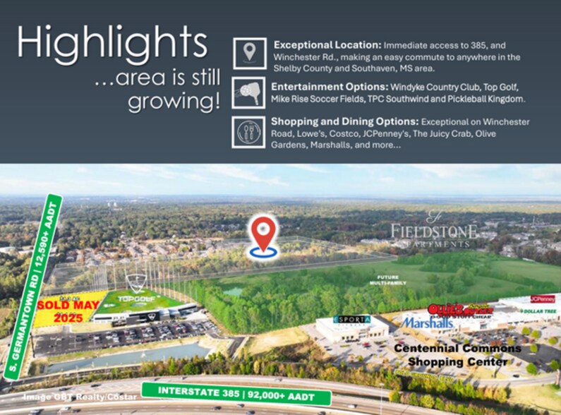Centennial Commons Parcel at 3320 S. Germantown Rd., Memphis, TN 38119 Offering a prime 84.2± acre development opportunity, the Centennial Commons Parcel is strategically located in a thriving area near Topgolf Memphis. Boasting exceptional visibility and accessibility, this property is perfect for a mixed-use development, senior living community, or office park. With a frontage of 1,000 SF on Germantown Rd., it presents an ideal canvas for creating a vibrant community hub. Situated in a high-traffic area with 13,700+ VPD, this rare large-scale tract combines accessibility, demographics, and demand, making it one of the most compelling development sites in the Memphis metro. The location offers immediate access to Interstate 385, Winchester Rd., and a variety of entertainment, shopping, and dining options, ensuring a convenient and dynamic environment for residents and businesses alike. Don't miss this outstanding opportunity to shape the future of this dynamic growth corridor!