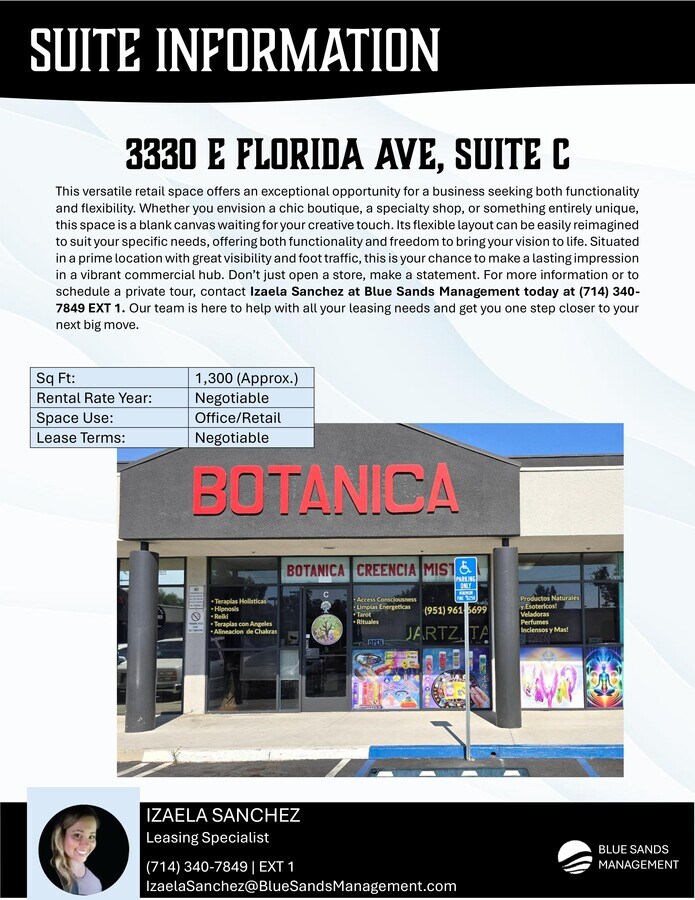 (Available Date: 04/01/2026) This versatile retail space offers an exceptional opportunity for a business seeking both functionality and flexibility. Whether you envision a chic boutique, a specialty shop, or something entirely unique, this space is a blank canvas waiting for your creative touch. Its flexible layout can be easily reimagined to suit your specific needs, offering both functionality and freedom to bring your vision to life. Situated in a prime location with great visibility and foot traffic, this is your chance to make a lasting impression in a vibrant commercial hub. Don’t just open a store, make a statement. For more information or to schedule a private tour, contact Izaela Sanchez at Blue Sands Management today at (714) 340-7849 EXT 1. Our team is here to help with all your leasing needs and get you one step closer to your next big move.