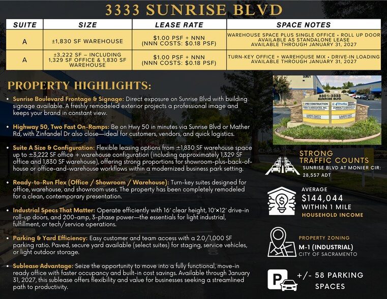 Sublease opportunity at 3333 Sunrise Blvd, Suite A in Rancho Cordova offering a clean, modern flex suite with direct Sunrise Boulevard frontage and signage potential. Two configurations are available: ±1,830 SF warehouse space with a private office, or the full ±3,222 SF mix featuring ±1,329 SF of turn-key office and ±1,830 SF of warehouse. The suite supports efficient operations with 16’ clear height, a 10’x12’ drive-in roll-up door, and 200-amp 3-phase power. Fast access to Highway 50 via nearby on-ramps makes the location functional for customers, vendors, and daily logistics. Sublease term runs through January 31, 2027 at $1.00 PSF + NNN (NNN: $0.18 PSF).