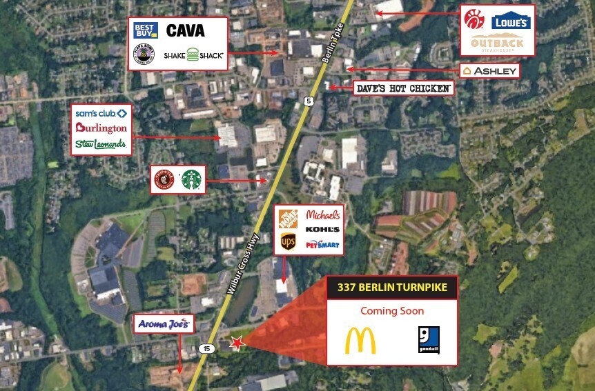 337 Berlin Turnpike is a retail development with an industrial component on an approximately 10 acre site along Central Connecticut’s most traveled commercial corridors. This newly developed center will feature a new McDonald’s and Goodwill, drawing consistent consumer traffic and enhancing the property’s overall visibility. Located within a dense retail corridor surrounded by national brands such as Home Depot, Starbucks, Chipotle, and Kohls. 337 Berlin Turnpike offers an outstanding opportunity for retail, restaurant, or service users seeking a high-exposure location in the heart of Berlin, Connecticut.