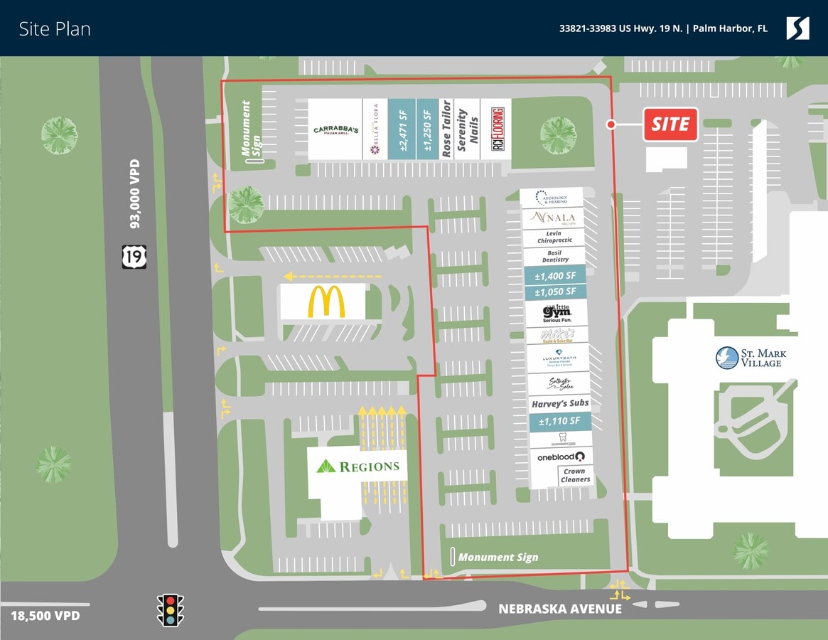 Sabal Ridge Plaza is a highly visible neighborhood retail destination positioned directly along US Highway 19 North in Palm Harbor, one of Pinellas County’s most established and affluent suburban trade areas. The property benefits from exceptional daily exposure with traffic counts of approximately 93,000 vehicles per day along US-19 and strong secondary traffic along Nebraska Avenue, creating consistent visibility and repeat customer flow for tenants. The plaza is strategically situated at a signalized, hard-corner intersection with multiple points of ingress and egress, allowing for smooth circulation and convenient access for both northbound and southbound traffic. Monument signage provides prominent branding opportunities directly facing the corridor, reinforcing tenant presence within one of Tampa Bay’s most traveled retail arteries. Sabal Ridge Plaza is surrounded by a dense and affluent residential base, with average household incomes exceeding $116,000 within a five-mile radius and strong daytime population counts that support a wide range of retail, service, and dining concepts. The immediate trade area includes national and regional retailers, grocers, fitness users, and medical services, creating a balanced tenant mix that drives daily traffic throughout the week. The center offers ample on-site parking and a functional site layout that supports both quick-stop and destination-oriented retail uses. Existing tenancy and nearby national retailers further anchor the corridor and contribute to sustained consumer draw. Sabal Ridge Plaza represents a compelling opportunity for retailers seeking strong visibility, accessibility, and long-term positioning in a proven Tampa Bay submarket.