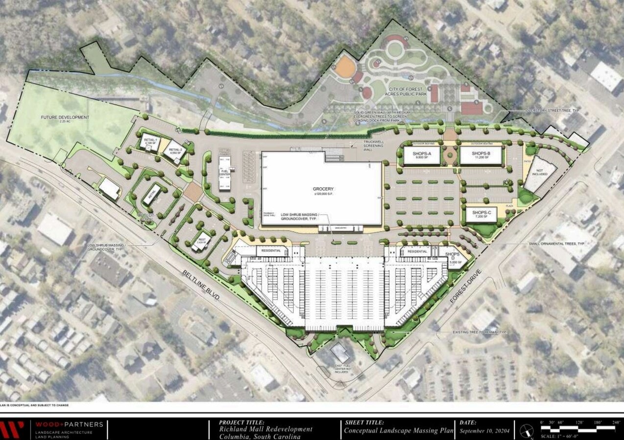 OUR RICHLAND MALL REDEVELOPMENT IS LOCATED IN FOREST ACRES, JUST NORTH OF DOWNTOWN COLUMBIA AND THE UNIVERSITY OF SOUTH CAROLINA. WITH SOME OF THE STRONGEST DEMOGRAPHICS IN THE MSA, FOREST ACRES SUPPORTS MANY OF THE REGION’S LARGEST RETAILERS AND IS ONE OF THE MOST SOUGHT-AFTER AREAS IN THE MARKET. THE PROJECT WILL FEATURE A NEW 120,000 SF KROGER MARKETPLACE, 380 CLASS A MULTIFAMILY UNITS, AND APPROXIMATELY 40,000 SF OF ADDITIONAL RETAIL SPACE. A FIVE-ACRE CITY PARK WITH AN AMPHITHEATER WILL SERVE AS A CENTRAL GATHERING PLACE FOR COMMUNITY EVENTS.