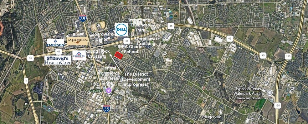 NEC du boulevard Greenlawn et de l'avenue Pflugerville, Round Rock, Texas 78664 Directement au sud de l'école Idea Charter, à moins de 1,6 km du campus Dell, des magasins, des bureaux, des hôtels et des restaurants de Target, Walmart, HEB et La Fronterra.