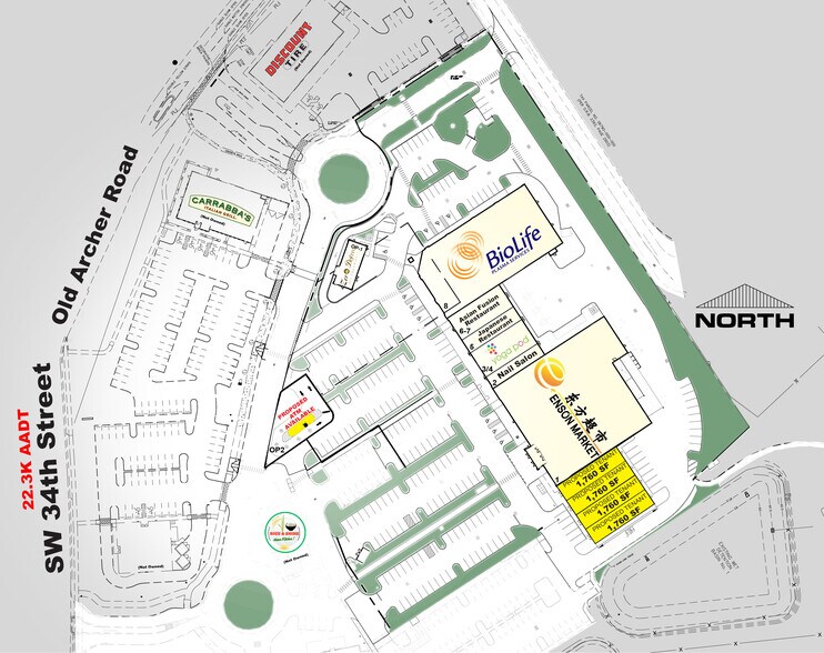 Espace commercial à louer à Gainesville, en Floride, dans le comté d'Alachua. Le centre commercial récemment construit est ancré par le club de bien-être You Fit et situé juste à côté de SW 34th Street et de SW Archer Road. Une épicerie entièrement équipée de +/-23 800 pieds carrés est disponible à la location à proximité du campus de l'Université de Floride.