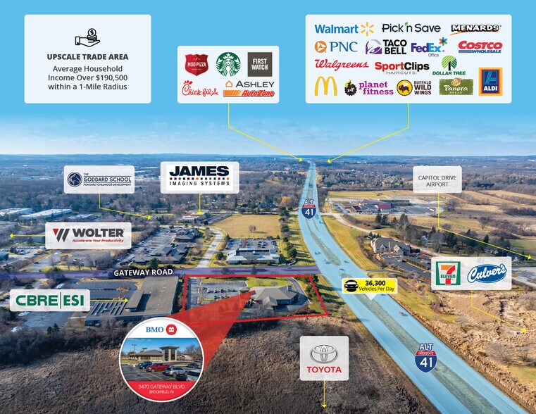 The 9,829-SF bank building with three drive-thru lanes on a spacious 2.74-acre parcel is located directly on the hard-corner intersection of W Capital Drive (I-41 ALT) and Gateway Road, which has a combined traffic count surpassing 36,300 VPD. Brookfield is part of the Milwaukee-Racine-Waukesha combined statistical area, which has a population of over 2 million, and is within 20 miles of downtown Milwaukee. The branch has annual deposits exceeding $72 million with strong historical performance.
