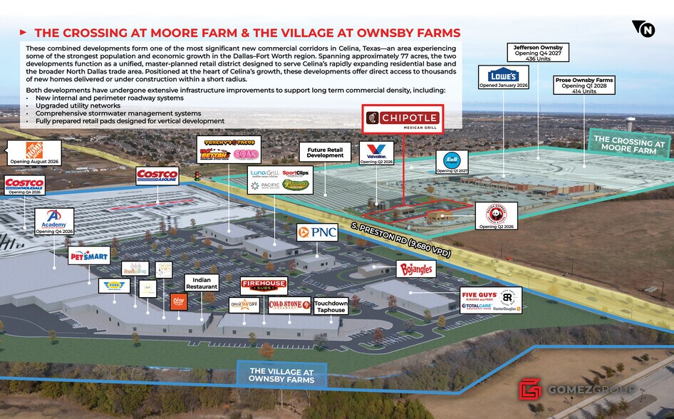 Chipotle is a brand new 2026 construction single-tenant investment opportunity at The Crossing at Moore Farm—a premier mixed-use destination positioned at the gateway to one of the fastest growing cities in North Texas. The tenant occupies 1.10 acres and is projected to open in Q4 2026. The building will feature a “Chipotlane” digital pickup lane, a high-demand format that continues to outperform in fast-growing suburban markets. The Crossing at Moore Farm and The Village at Ownsby Farms together form a unified +77-acre master-planned retail district anchored by Lowe’s and EOS, with Home Depot, Costco, Costco Gasoline and Academy Sports. The property sits immediately adjacent to Jefferson Ownsby and Prose Ownsby Farms—two new Class A multifamily communities totaling 850-units, which will serve as the residential anchor for the district, creating a cohesive mixed-use region that will blend commerce with modern living. The offering includes a 10-year NNN lease with four 5-year renewal options, providing up to 30 years of potential tenancy.