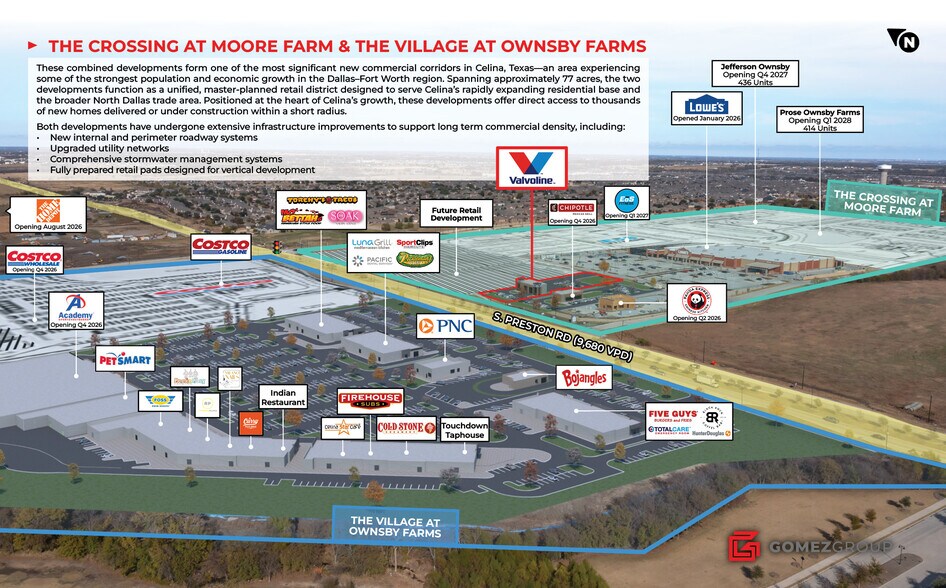 Valvoline is a brand new 2026 construction single tenant investment opportunity at The Crossing at Moore Farm—a premier mixed-use destination positioned at the gateway to one of the fastest growing cities in North Texas. The tenant occupies 1.05 acres and is projected to open in Q2 2026. The Crossing at Moore Farm and The Village at Ownsby Farms together form a unified +77 acre master-planned retail district anchored by Lowe’s and EOS, with Home Depot, Costco, Costco Gasoline and Academy Sports. The property sits immediately adjacent to Jefferson Ownsby and Prose Ownsby Farms—two new Class A multifamily communities totaling 850-units, which will serve as the residential anchor for the district, creating a cohesive mixed-use region that will blend commerce with modern living. The offering includes a 15-year Absolute NNN ground lease with four 5-year renewal options, providing up to 35 years of potential tenancy, and 10% rent increases every 5 years allowing predictable, compounding cash flow.