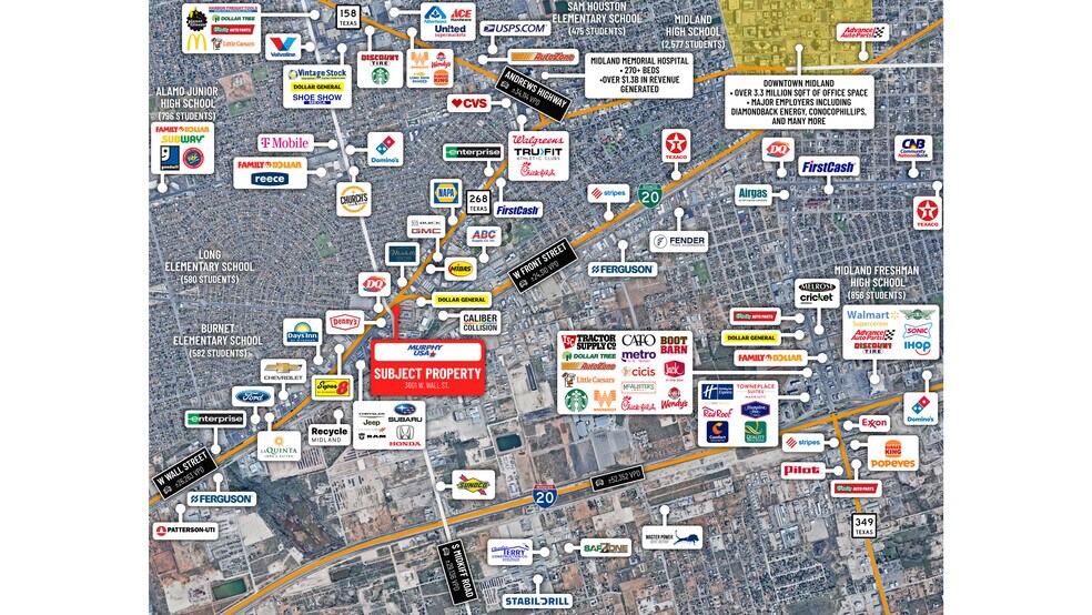 - On Corner of W Front St (24,310+ VPD) and S Midkiff St (29,136+ VPD), off of W Wall St (26,263+ VPD), Just North of I-20 (52,352+ VPD)