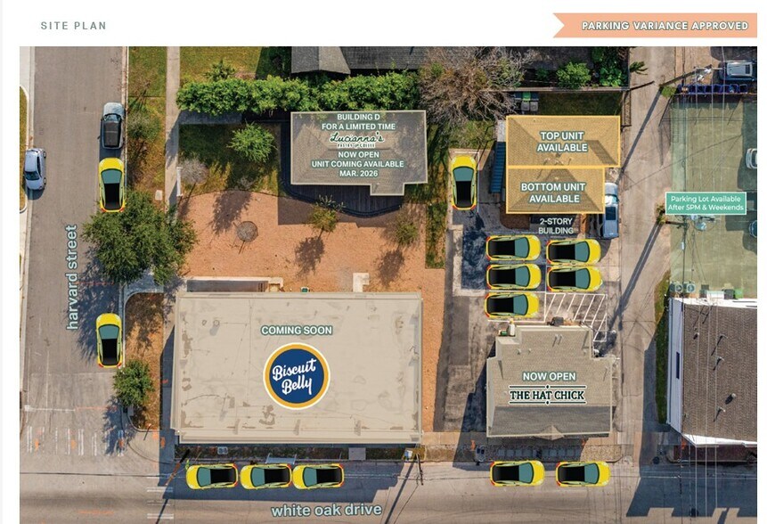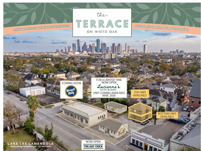 Bienvenue à The Terrace On White Oak, l'un des bâtiments les plus dignes d'Instagram de Houston ! Arborant la mémorable fresque murale « Greetings from Houston » de l'artiste Daniel Anguilu, ce bâtiment est une séance photo prisée par les habitants comme par les visiteurs. Situé dans le quartier animé de White Oak et entouré de restaurants et de bars réputés, ce bâtiment historique de Houston Heights convient parfaitement à un petit restaurant, avec un patio de jardin pittoresque à l'arrière de la boutique. Faites du cœur de The Heights votre maison dans l'un des bâtiments les plus emblématiques de Heights.