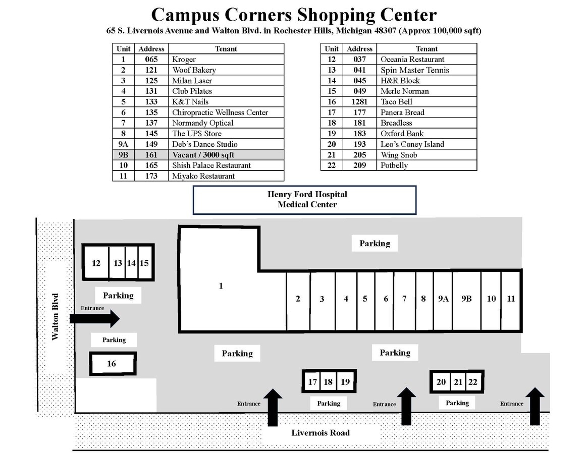Campus Corners Shopping Center 37-173 S Livernois Rd Espace disponible | 279 m² | Local commercial | Rochester Hills, MI 48309