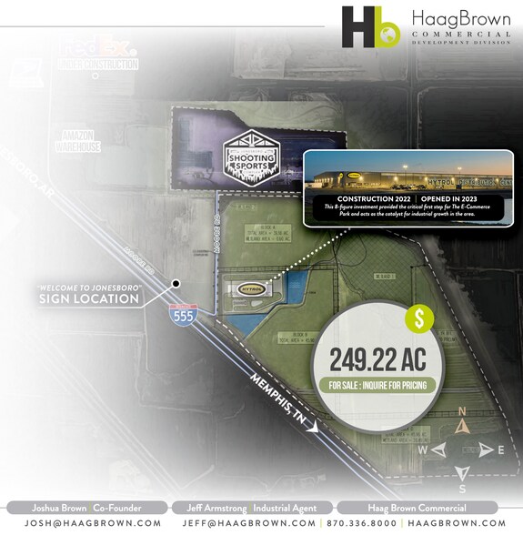 Haag Brown Industrial est heureuse de présenter l'opportunité d'acheter (2) de grands sites dans le nouveau parc de commerce électronique de Jonesboro, le premier parc de logistique, d'entreposage et de distribution numérique ultramoderne du nord-est de l'Arkansas, stratégiquement situé sur 260 acres aux portes de Jonesboro. Avec plus de 3 300 pieds de façade sur l'Interstate 555, le projet offre une accessibilité mondiale, étant donné qu'il se trouve à une journée de route de 70 % des principaux marchés américains. De plus, il se trouve à moins d'une heure de route de Memphis, dans le Tennessee, le principal centre de distribution du pays, et du comté de Mississippi, en Arkansas, le producteur d'acier #1 en Amérique. L'emplacement est donc idéal pour les entreprises de logistique, de fabrication et de commerce électronique. Le parc est conçu dans un souci de flexibilité et s'adresse à un large éventail de secteurs, des grands centres de distribution aux petites opérations de distribution numérique. Les sites sont zonés pour un usage industriel et offrent la possibilité de proposer des solutions personnalisées sur mesure. Cela en fait une excellente option pour les entreprises qui cherchent à se développer ou à établir une présence dans la région. L'infrastructure est déjà en place, y compris l'accès aux services publics tels que l'eau, les égouts, le gaz naturel et l'électricité, ce qui rationalise le processus de développement pour les acheteurs potentiels. De plus, le parc n'est pas situé dans la plaine inondable récemment reconfigurée, ce qui garantit que les sites sont sûrs, sécurisés et constructibles sans les complications associées aux zones sujettes aux inondations. Cet emplacement de choix offre une accessibilité et une visibilité inégalées aux entreprises à la recherche d'un espace de travail dynamique. Les lots disponibles sont situés au nord et au sud du tout nouvel entrepôt de distribution de 150 000 pieds carrés d'Hytrol et juste à côté de la nouvelle usine du dernier kilomètre d'Amazon, plaçant ces sites au cœur de l'écosystème industriel et de commerce électronique en pleine croissance de Jonesboro. Grâce à sa proximité des principaux réseaux de transport et des principaux corridors interétatiques, ainsi qu'à une infrastructure bien établie, E-Commerce Park est conçu pour soutenir les entreprises qui misent sur la rapidité, l'efficacité et la connectivité mondiale. Il s'agit d'une opportunité exceptionnelle pour les entreprises qui souhaitent profiter de l'un des emplacements les plus stratégiques et les plus accessibles de la région.