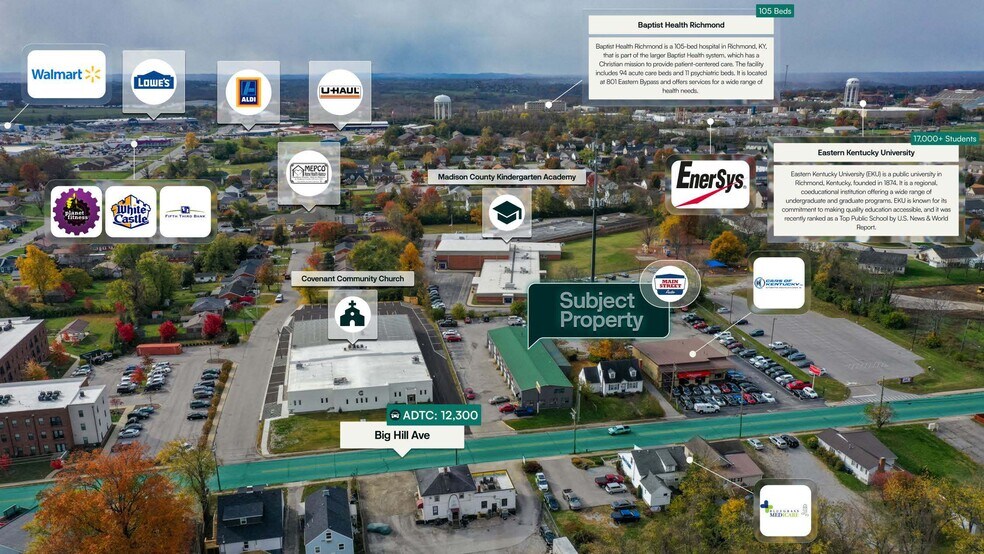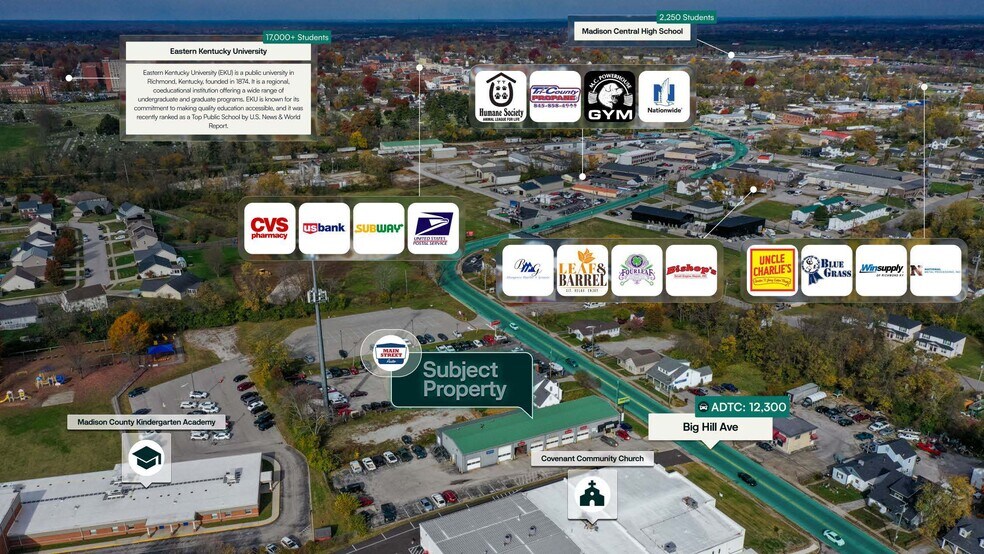 Surmount and Bang Realty are pleased to present the exclusive listing for a Main Street Auto located at 376 Big Hill Ave, Richmond, KY 40475. The site consists of roughly 7,405 rentable square feet of building space on an estimated 0.61-acre parcel of land. This Main Street Auto is subject to a 20-year Triple Net (NNN) lease, which commenced 2/20/2025. The current annual rent is $210,000 and has scheduled increases of 2.00% annually starting 3/1/2031.
