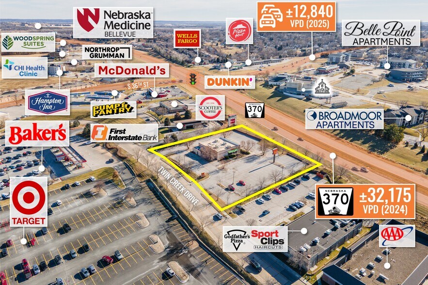 Built in 2005, the Property consists of a ±4,506-SF single-story building situated on an expansive ±1.59-acre parcel (±69,059 SF) with a concrete surface parking lot providing 94 parking spaces. Strategically positioned as an outparcel to Twin Creek Plaza, which is anchored by Target, the site benefits from two points of ingress and egress and dual road frontage, including ±226 feet along Twin Creek Drive and ±230 feet along State Highway 370, which carries ±32,175 vehicles per day (VPD). This positioning just off of S 36th Street (±12,840 VPD) ensures excellent visibility, strong traffic exposure, and convenient access within the greater Omaha metropolitan area. Previously leased to Village Inn Restaurant on a triple-net (NNN) basis, the Property presents a value-add opportunity through lease-up at long-term market rents, with CoStar estimating retail rental rates in the range of $27-33/SF NNN. Zoned BG, General Business, the Property can accommodate a wide variety of retail, service, and community-oriented uses, further enhancing its flexibility and long-term investment appeal.
