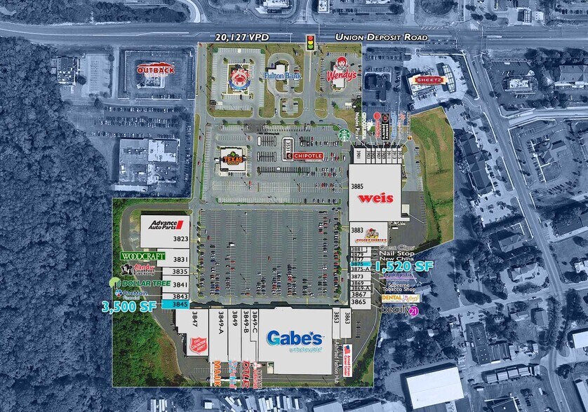 Le centre commercial est ancré par Weis Markets et Gabe's. Les sites intérieurs incluent Texas Roadhouse, Chipotle, Wendy's et Fulton Bank. L'extension a une façade le long de Union Deposit Road. Le centre est idéalement situé à l'intersection de Union Deposit Road et de l'Interstate 83.