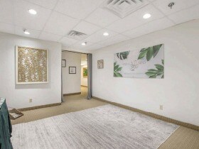 1,380sqft move-in ready office suite featuring private rooms, reception area, and a full glass wall ideal for a conference room or collaborative workspace. The suite includes a private sink, abundant lighting, and highly efficient layout that presents well to clients.