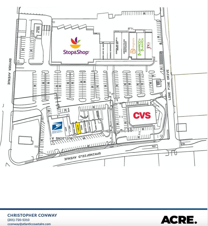 Anchored by Stop & Shop, CVS, USPS and numerous national tenants. Front outparcel position facing Springfield Avenue between two signalized intersections with tremendous facade signage. Perfect for wireless stores, boutique fitness and numerous other users.