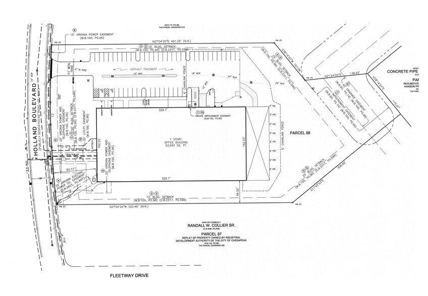 LOCATION: 3944 Holland Boulevard Chesapeake, Virginia 23323 BUILDING SIZE: Total Building +/-60,000 sq. ft. Shop/Storage +/- 56,000 sq. ft. Office +/- 4,000 sq. ft. Mezzanine +/-4,000 sq. ft. LAND AREA: 5.196 Acres ZONING: M-1 (Light Industrial) ELECTRICAL SERVICE: 3 Phase, 2000 Amp, 480 Volt LOADING DOORS: 1- 8' x 10' 48'' loading well (with load leveler and dock seal) 1- 10' x 14' grade level (electric opener) 2- 14' x 14' grade level (electric opener) CEILING HEIGHT: 21' 09'' - 24' 04'' to the roof deck CLIMITAZATION: 100% of the office and manufacturing/warehouse area is fully conditioned CRANES: One – 15-Ton Crane One – 10-Ton Crane Five - 5- Ton Cranes One – 4-Ton Crane One - 3-Ton Crane Eleven – ½ Ton Cranes BUILDING DIMENSIONS: 160' wide x 375' deep LIGHTING: Office - Fluorescent Tube Shop – Low pressure sodium FLOOR: 6" Reinforced Concrete EXTERIOR WALLS: Split faced block/ concrete block and metal panels SPRINKLER SYSTEMS: Wet system ADDITIONAL INFORMATION: * Original building constructed 1990 (40,000 s.f.) * Building addition constructed 2001 (20,000 s.f.) * Mezzanine above office area approximately (4,000 s.f.) * 52,000 square feet of the total space is heat & cooled * 3 shop restrooms, 2 with showers * 2 office restrooms * 50 marked parking spaces * Outside lighting * Fenced yard/ loading area LEASE: $10.95 psf NNN NNN: TBD SALE: Contact Broker