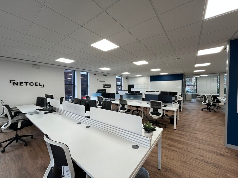 This modern Grade A office building offers a ground floor office suite arranged in an open plan layout, incorporating partitioned meeting rooms and a spacious breakout/kitchen area. The office is fully fitted to a high specification, making it suitable for a wide range of occupiers. Specification includes raised access floors, suspended ceilings with recessed CAT II lighting, and air-conditioning throughout. The property also benefits from 13 dedicated parking spaces located within the rear car park.