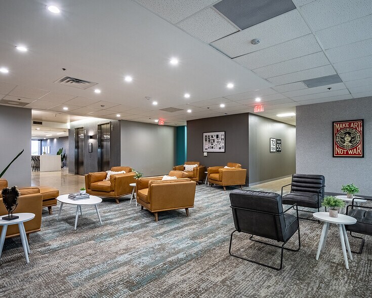 Private reception area and 5 window office, Open area. Includes shared conference rooms, huddle rooms, lounge, coffee bar, and WiFi.