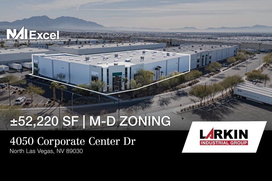 ±52,220 SF industrial sublease opportunity located at 4050 Corporate Center Drive in North Las Vegas. The property features M-D zoning, 32’ clear height, ESFR sprinklers, LED lighting, skylights, and robust power (3-phase, 277/480V, 800 amps). Loading is well accommodated with twelve dock-high doors, multiple edge-of-dock plates and pit levelers, plus one oversized grade-level door. The building includes ±657 SF of HVAC-served office space and is available immediately, with sublease term through February 28, 2029.