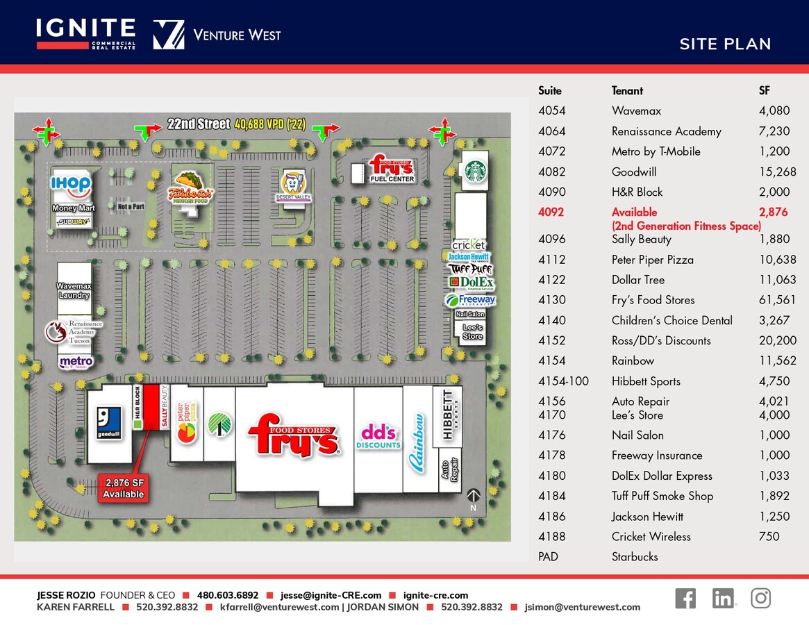 Le centre commercial Fry's Food & Drug propose un mélange dynamique comprenant notamment Dd's Discounts, Peter Piper Pizza, Sally Beauty, Denny's et bien d'autres encore, y compris un futur consommateur national de café ! Ce centre est bien géré avec d'excellents locataires.