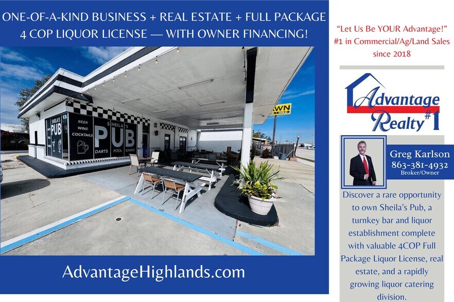 ONE-OF-A-KIND BUSINESS + REAL ESTATE + FULL PACKAGE 4 COP LIQUOR LICENSE — WITH OWNER FINANCING! Discover a rare opportunity to own Sheila’s Pub, a turnkey bar and liquor establishment complete with valuable 4COP Full Package Liquor License, real estate, and a rapidly growing liquor catering division. Perfectly positioned on a prime corner lot between the iconic Downtown Circle and the high-traffic Sebring Parkway—directly across from Faded Bistro—this location offers exceptional visibility, accessibility, and long-term growth potential. Inside, the pub features 61 indoor seats, a welcoming covered front patio, and an additional private rear seating area—ideal for special events, tastings, or expanding the catering operation. But what truly sets this property apart is its incredible upside potential. Continue the current 12 Hours of Sebring racing theme or reimagine the space entirely. One inspired concept: transform it into an Old Florida Citrus–themed Country Store, similar to the beloved Maxwell Country Store in Avon Park. Imagine offering signature treats like Orange-Cickle ice cream, local honey, jams, and—only possible with a full liquor license—artisan orange-infused spirits and liqueurs. This unique twist could redefine the brand, attract tourists, and create an unforgettable destination experience. Whether expanding the liquor catering service, enhancing the existing pub, or developing a new themed retail attraction, the possibilities are extraordinary. To make this opportunity even more enticing, the seller is offering OWNER FINANCING with only $250,000 down! Businesses with this level of flexibility, location strength, and creative potential seldom come to market. Seize this chance to own a profitable, versatile property with unlimited vision and unique licensing value. Opportunities like this don’t come along often!