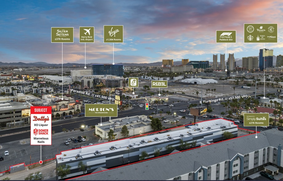 • Le bâtiment est actuellement en construction et sera livré au troisième trimestre 2025 • À la recherche d'utilisateurs dans les restaurants, les détaillants et les établissements médicaux • La nouvelle enseigne lumineuse à double face en forme de pylône mesurera 50 pieds de haut ! • Rejoignez Dotty's, Marvelous Nails, XO Liquor et Jass Smoke Shop dans un nouveau centre commercial situé à l'intersection très fréquentée de Flamingo et Paradise, qui dessert le Resort Corridor • Adjacent au complexe planifié à usage mixte de 68 acres, Hughes Center, composé de +/- 1,5 million de pieds carrés d'espaces de bureaux de classe A • Le centre de conventions de Las Vegas, le Strip de Las Vegas, l'université du Nevada, Las Vegas et l'aéroport international Harry Reid sont tous situés à moins de 3 km du centre • Forte population diurne à proximité avec ±725 760 personnes à proximité et environ ±519 855 employés dans un rayon de 8 milles. ?